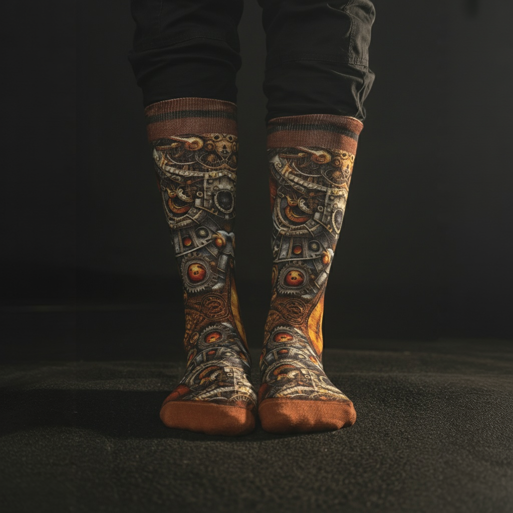 This 360° sock design fuses steampunk mechanics with mystical flair: spinning gears, metallic tones, and hidden systems echoing inner change.