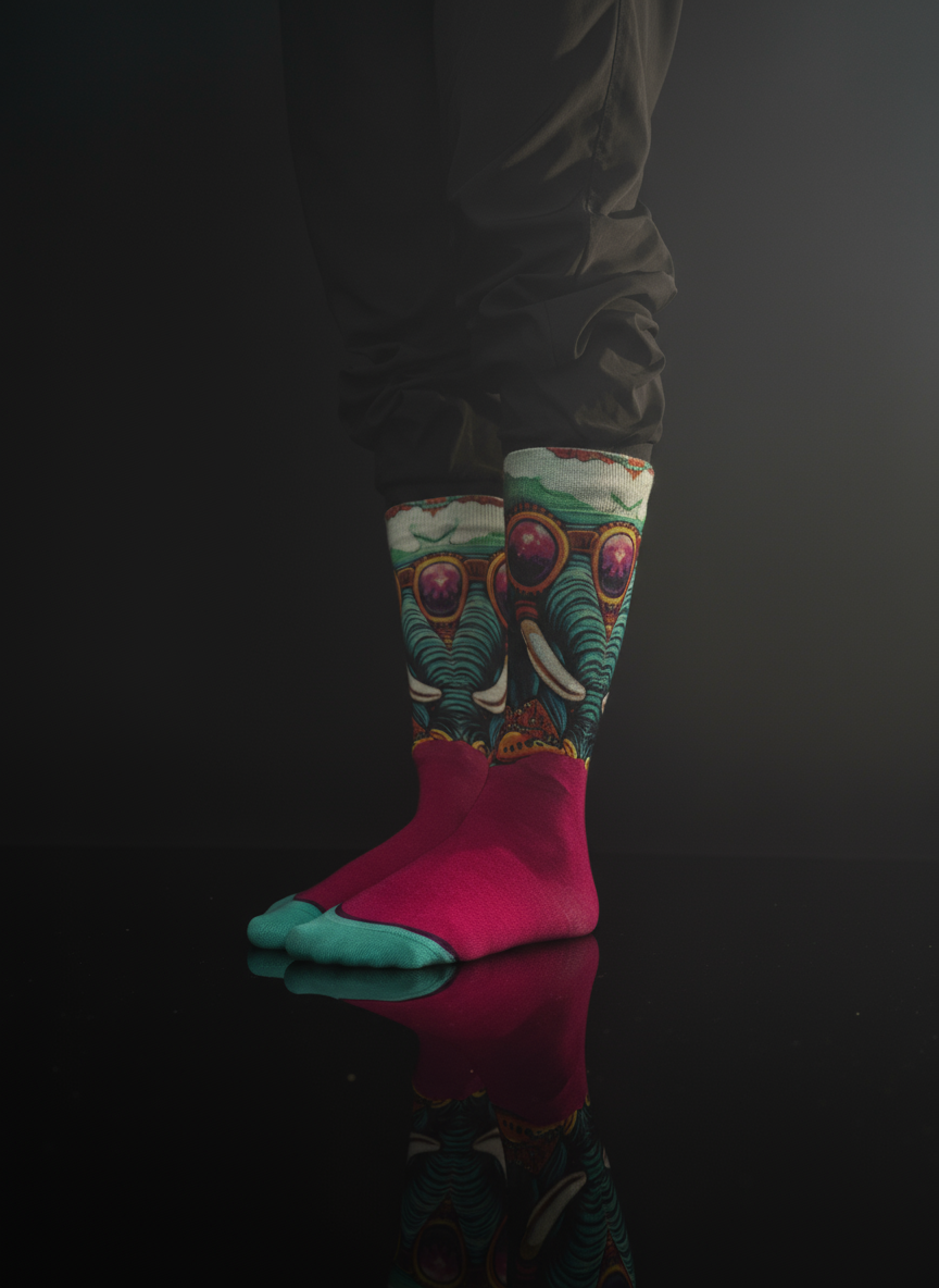At its center: an ancient elephant head, wrapped in tribal patterns and deep hues of teal, orange, and violet.