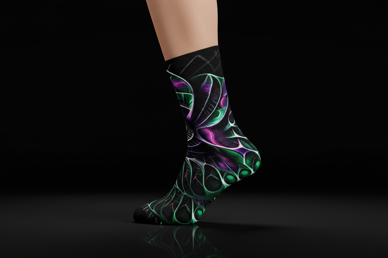 Inspired by the sacred lotus, this sock blooms with radiant symmetry and soft geometry.