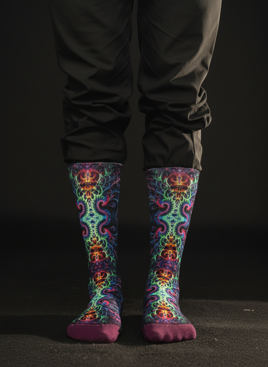 Inspired by the 90s Goa trance scene, this psychedelic sock merges rhythm, color, and emotion into one vibrant, nostalgic pulse.