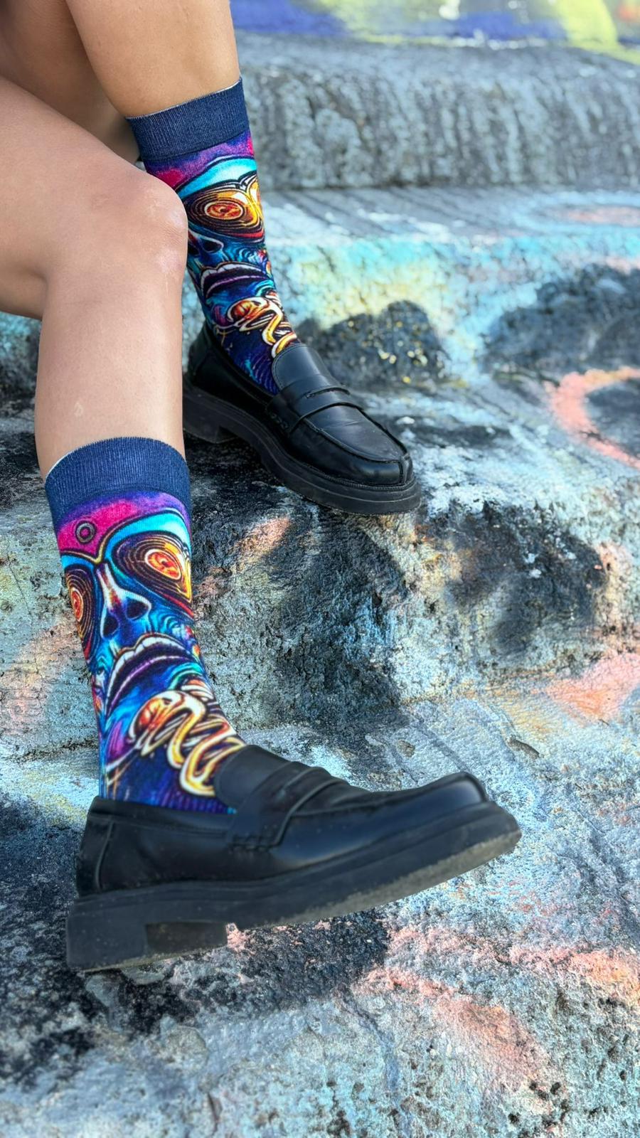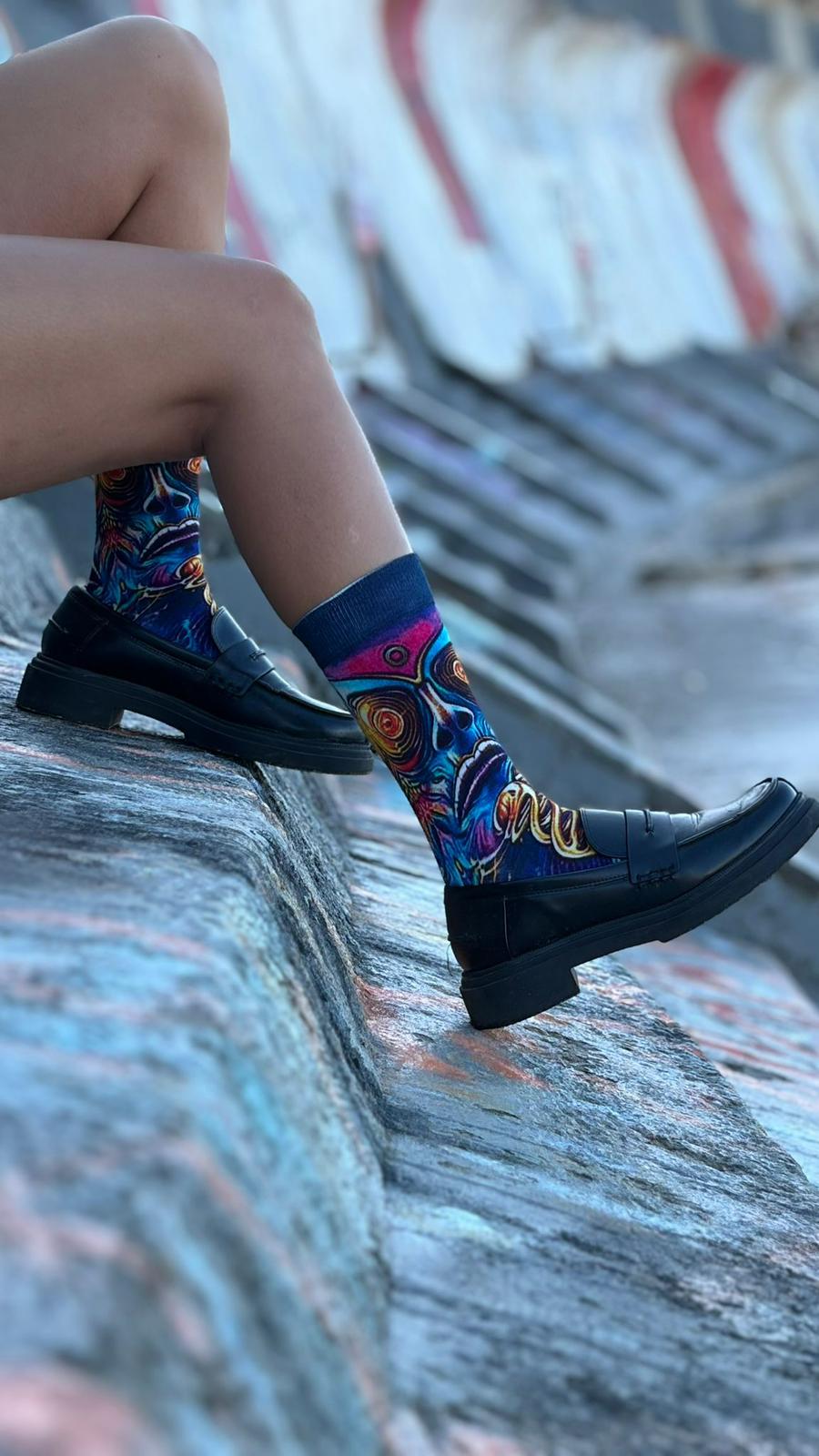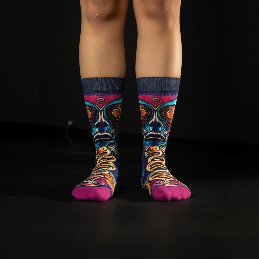 This sock pair stares back with full force. A bold, hypnotic face design and spiraling energy lines make it impossible to ignore.