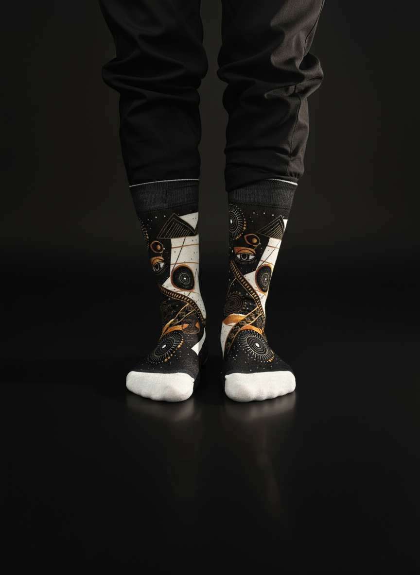 Featuring a golden all-seeing eye woven into sacred geometry, this design rests on a bold black-and-white backdrop.