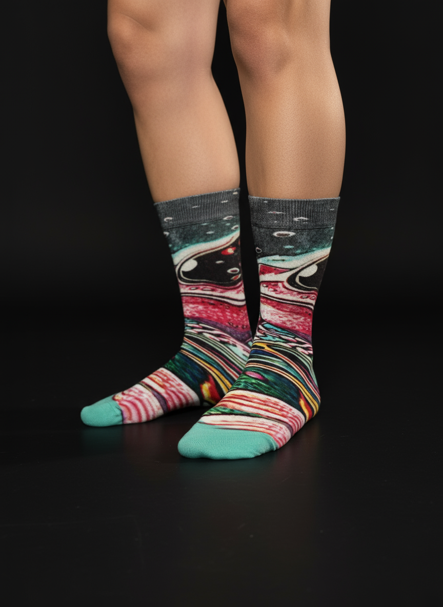 Inspired by the healing spirit of the Kambo frog, this sock pair blends psychedelic colors, sacred symbolism, and fierce softness.