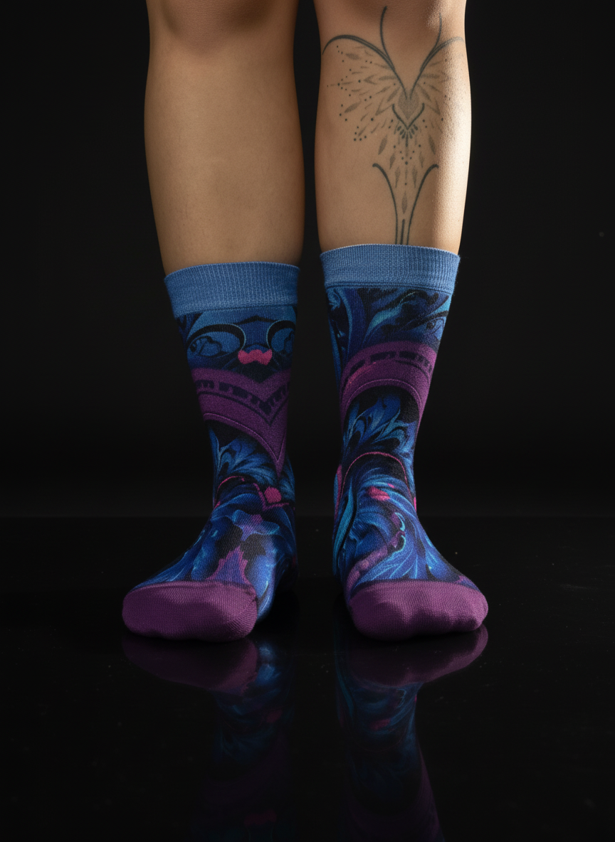 This design blends organic tribal forms with oceanic swirls of turquoise, violet, and pink.